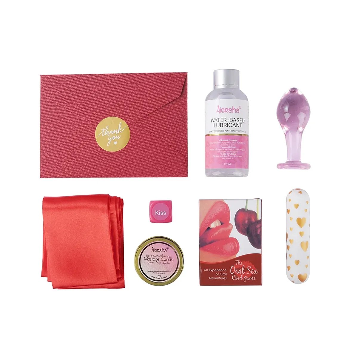 • Included: Lubricant, Body Paint, Massage Balm, Mini Vibrator, Glass Plug, Satin Eye Mask, Surprise Envelope, Gift Wrap & Bag.